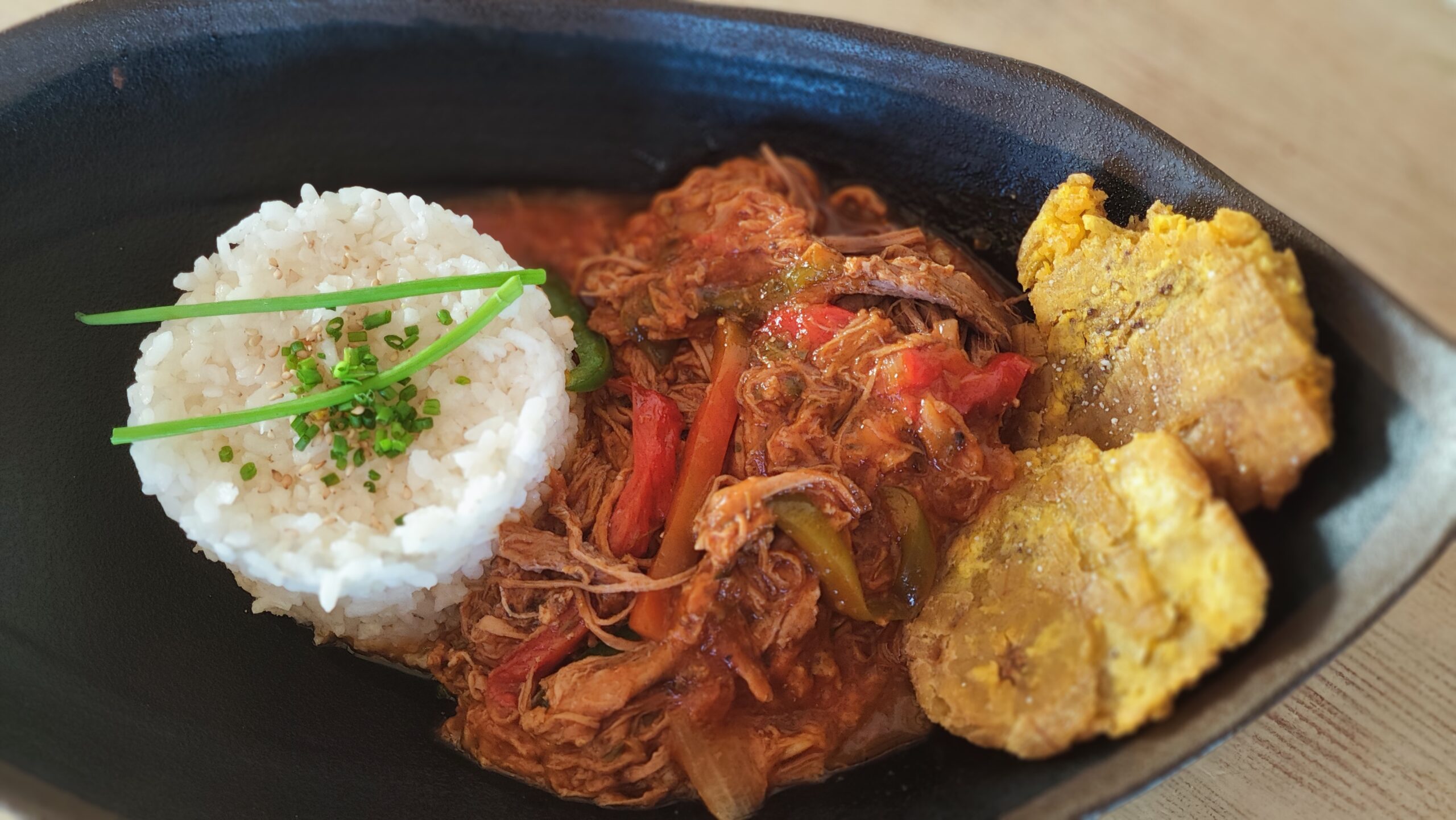A esta carne de ternera deshilachada y cocinada en salsa con verduras, se le conoce también como ropa vieja. Mézclala con el arroz y a empezar se ha dicho. Muerde un trocito de tostón (con la otra mano) de vez en cuando.