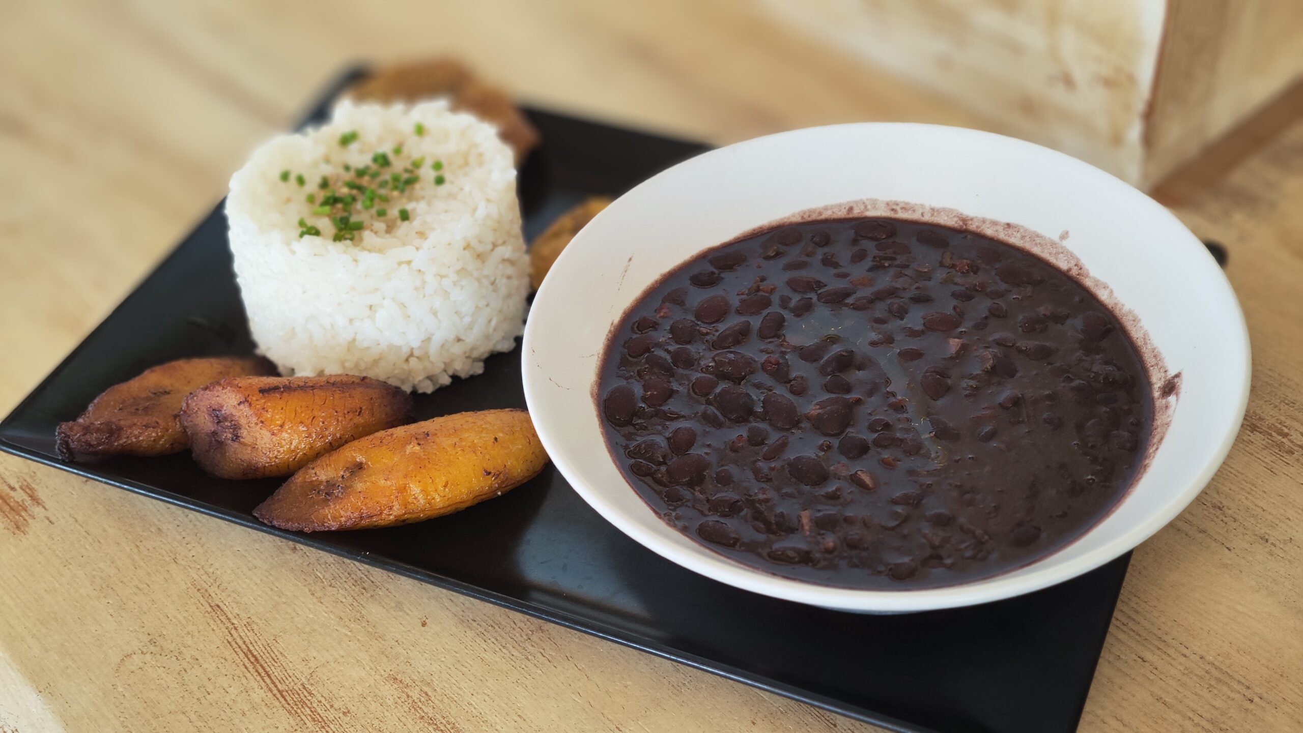 Potaje de alubias negras hechas con un potente sofrito, servidas con arroz blanco aromatizado y platanitos maduros fritos. En el caribe se mezcla todo y es el acompañante ideal para una buena carne. Plato vegetariano o vegano.