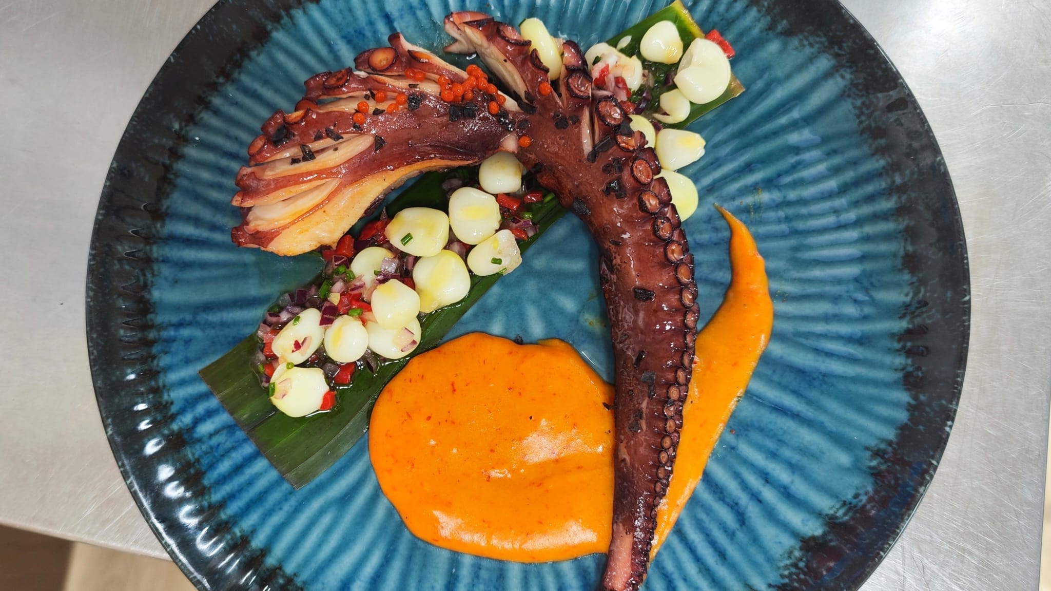 Pulpo a la brasa con parmentier, choclo aliñado, perlas de pimentón ahumado y sal negra Rejo que mimamos en nuestros fuegos, para que su carne esté en el punto adecuado y resulte un bocado exquisito. 22,00 €
