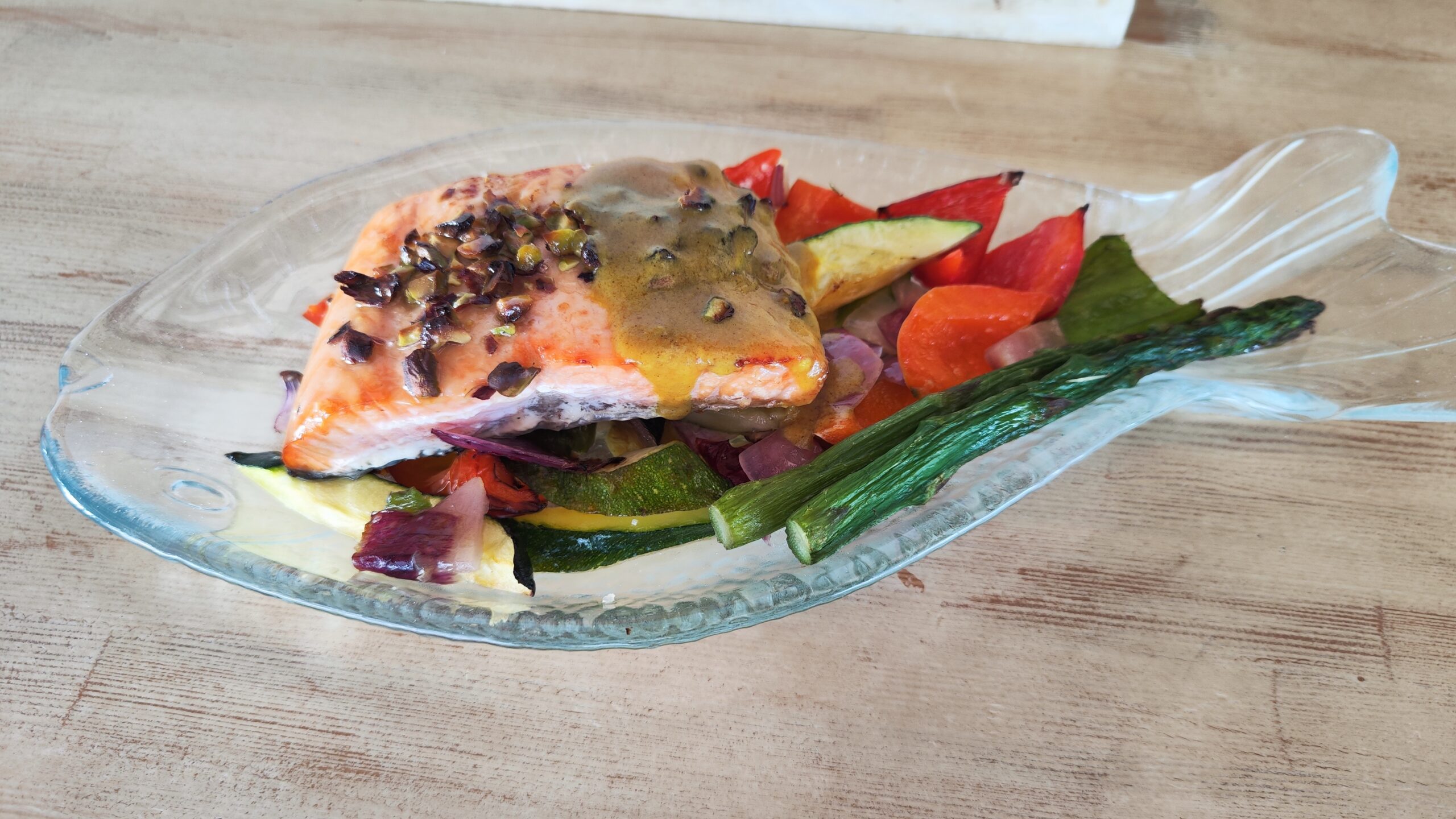 Suprema de salmón con verduras, pistacho y curry de coco Lomo limpio de salmón, sin una espina, con una parte impregnada de pistachos verdes, chips de verduras salteadas y salsa de curry con coco… no damos la receta!! 19,50 €