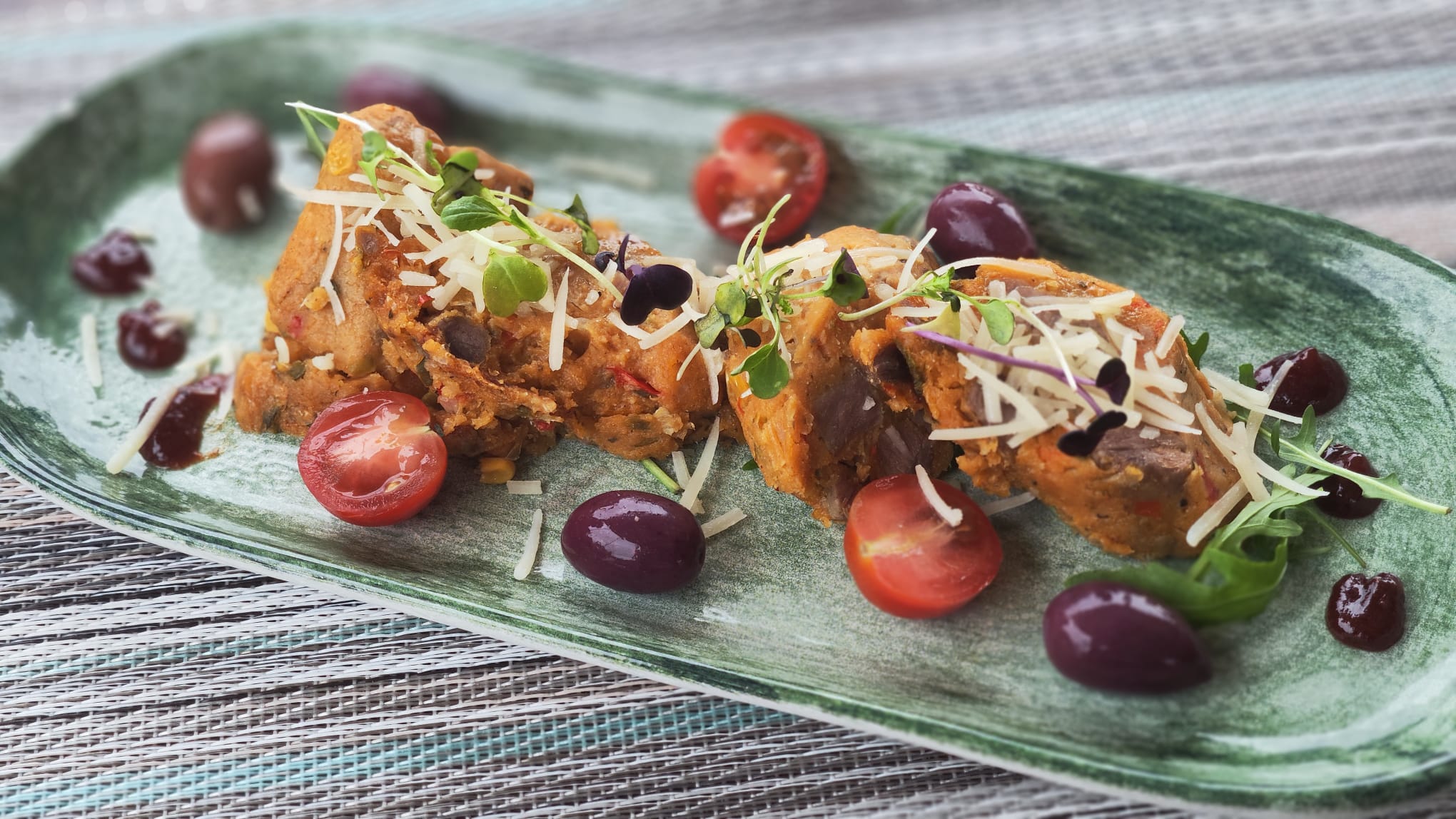 Tamal cubano con más salero (kalamatas, cherrys, chutney de tomate y ralladura parmesana)