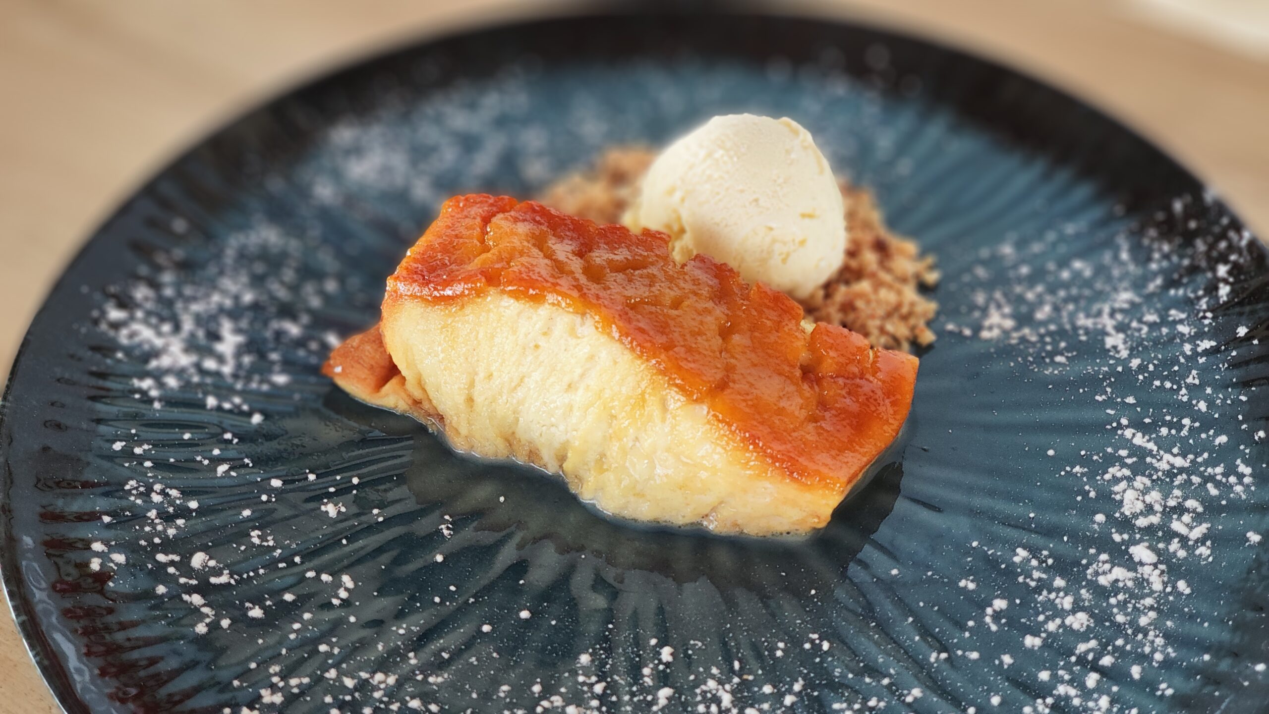 Torrija de pan brioche Clásica receta de la torrija, utilizando brioche en lugar de pan. Su textura es muy melosa y su sabor delicadamente dulce acentuado por su toque caramelizado, acompañada de helado de vainilla. 8,00 €