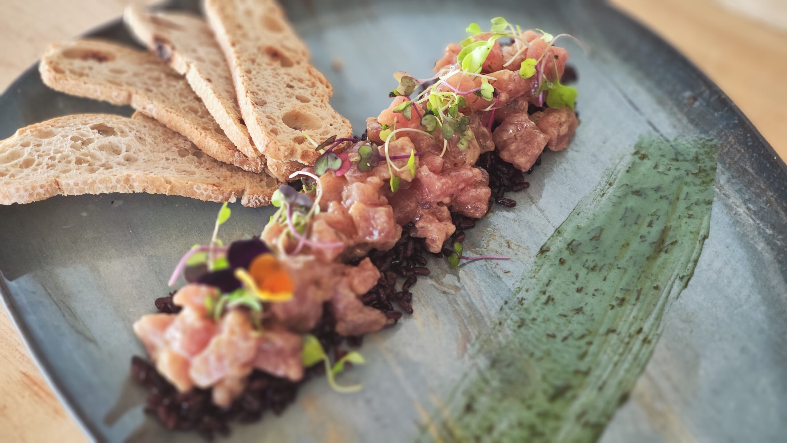Atún rojo cortado en pequeños dados con nuestro aderezo de especias y salsas, sobre cama de arroz prohibido. Apropiado para una ocasión de esas que te mereces.