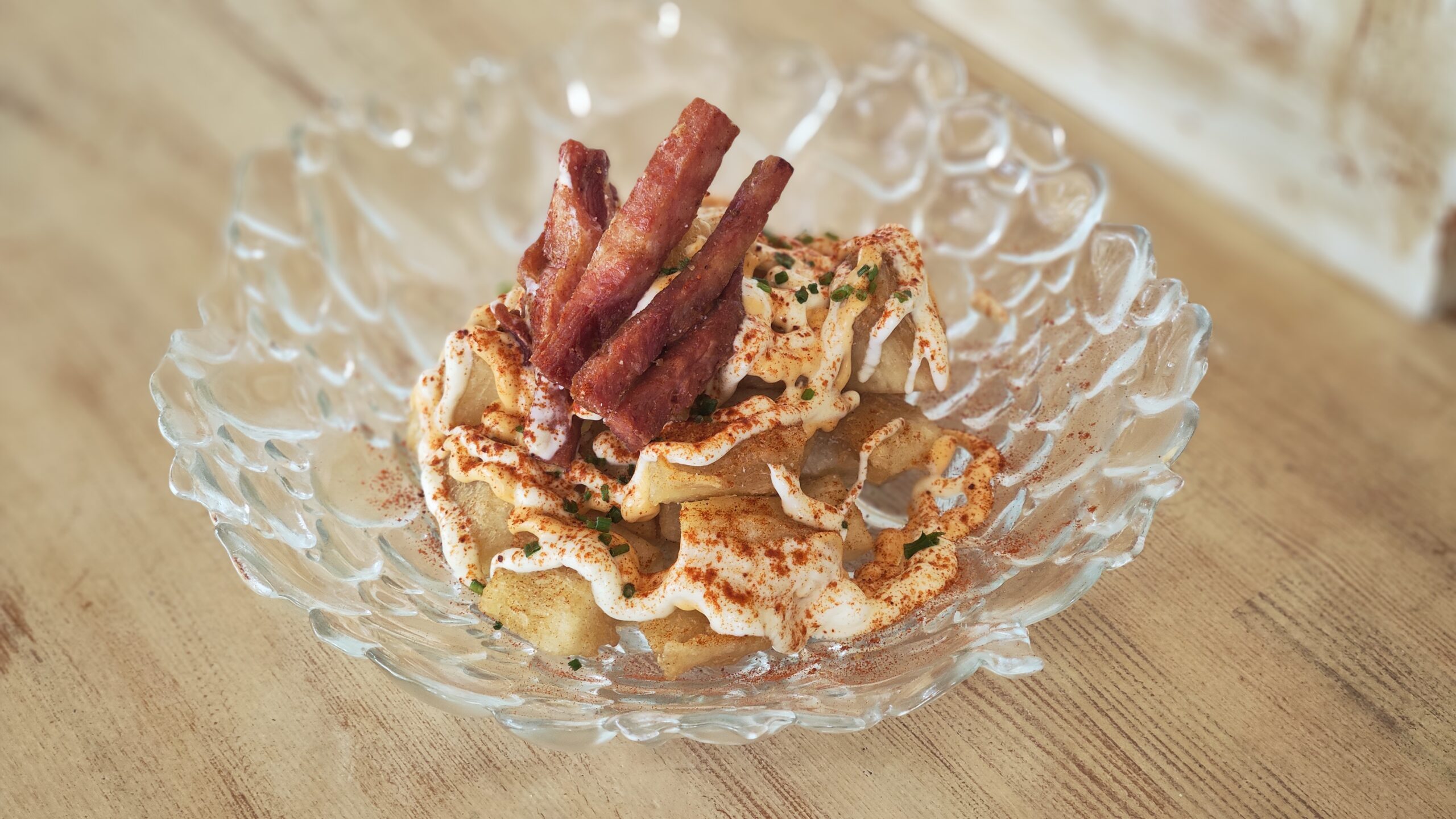La yuca es un tubérculo como la patata pero más cremosa aún. Se puede cocinar de varias maneras. Nosotros conservamos su esencia pero hacemos un guiño a la madre patria y ponemos crujientes y otras cositas. Es un plato que no falta en la mesa de la antigua cuba que ¡¡¡Ya volverá!!! Es un picoteo.